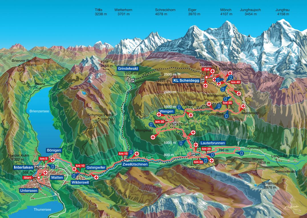 Závod startuje ve městě Interlaken ve výšce 566 m.n.m. Nejvyšší bod závodu je ve výšce 2205 m.n.m (Eigergletscher). Poslední kilometr před cílem na Kleine Scheidegg vede strmě z kopce.