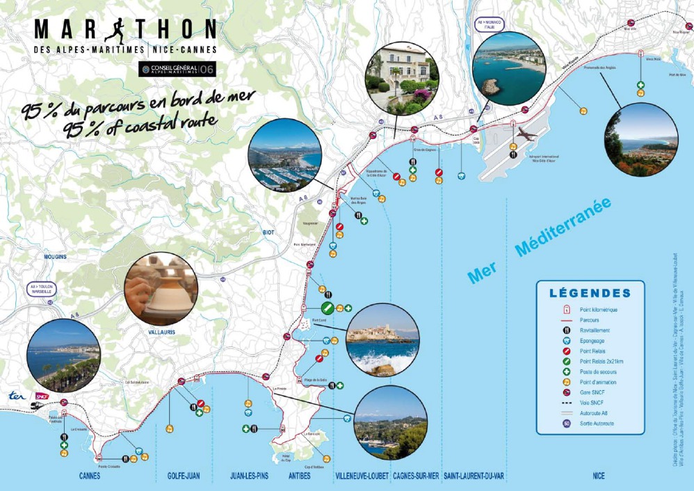 Maraton startuje v Nice na promenádě de Anglais a vede přes města proslulé francouzské riviéry a končí v Cannes,které je proslulé zejména svým filmovým festivalem.